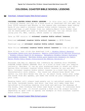 Download Colossal coaster bible school lessons Ebook PDF online is a convenient and frugal way to read Colossal coaster bible school lessons Ebook you love right from the comfort of your own home. Yes, there sites where you can get PDF "for free" but the ones listed below are clean from viruses and completely legal to use.